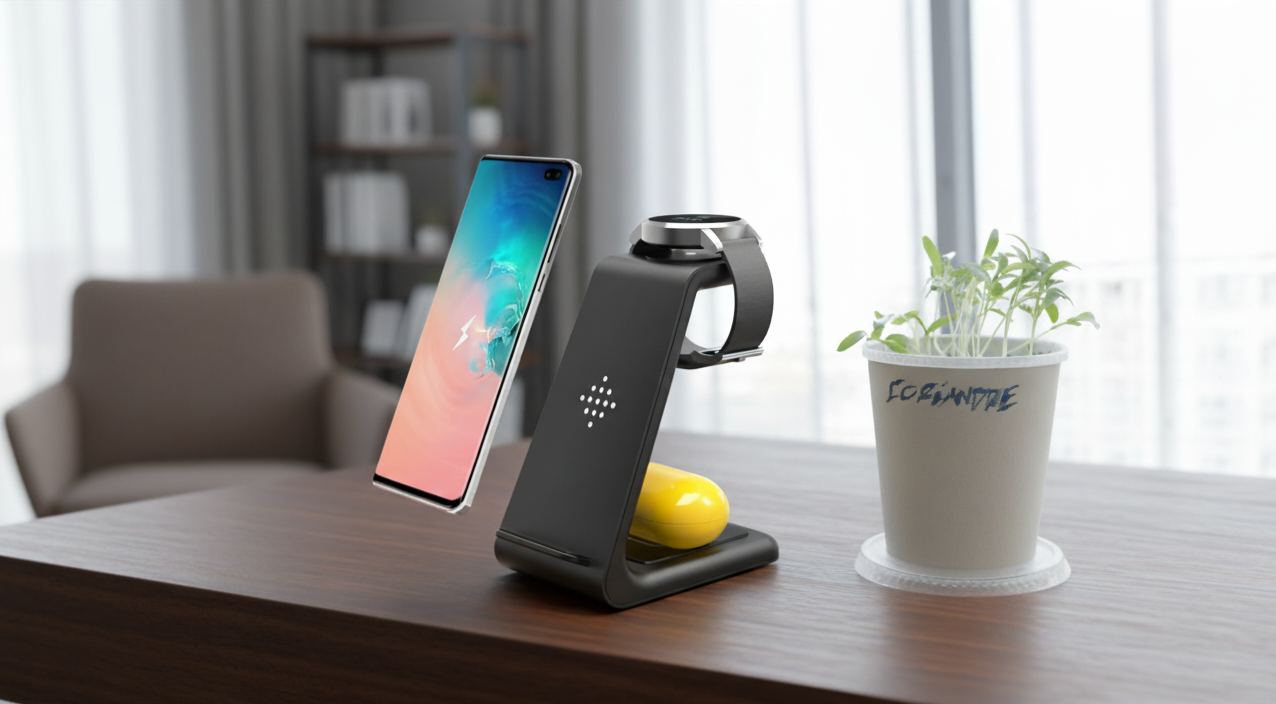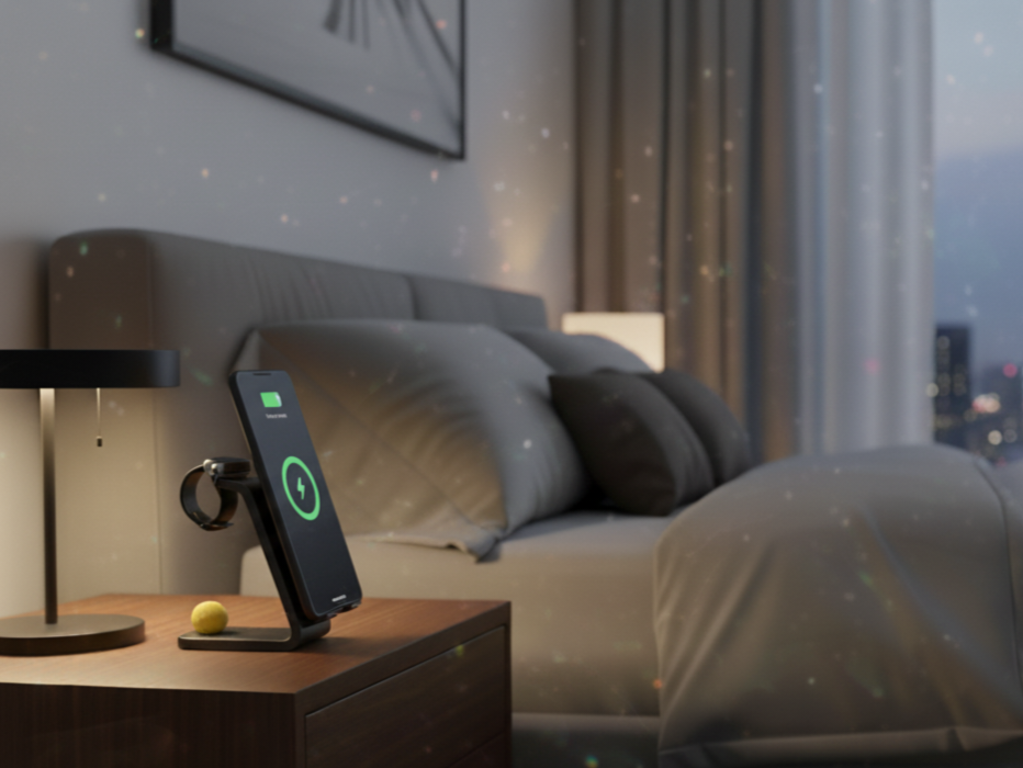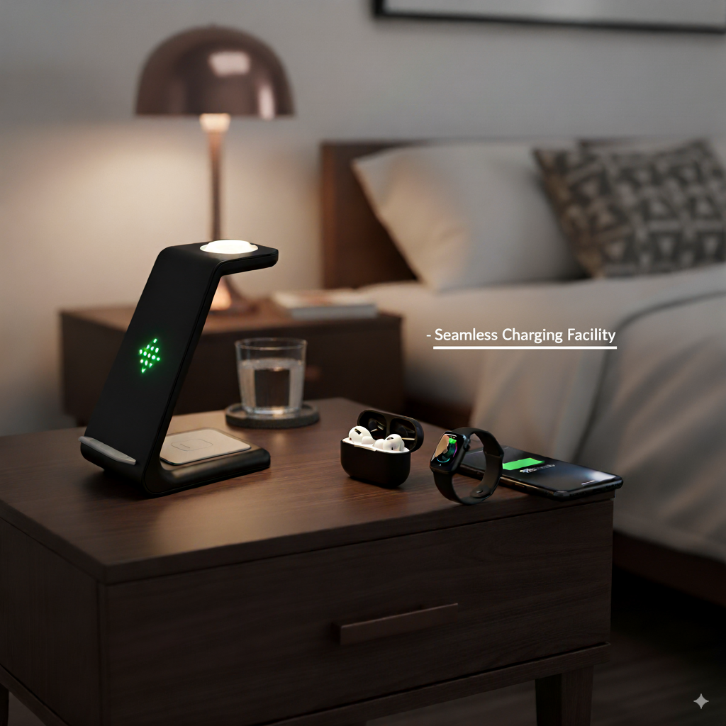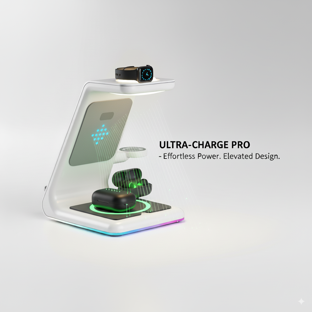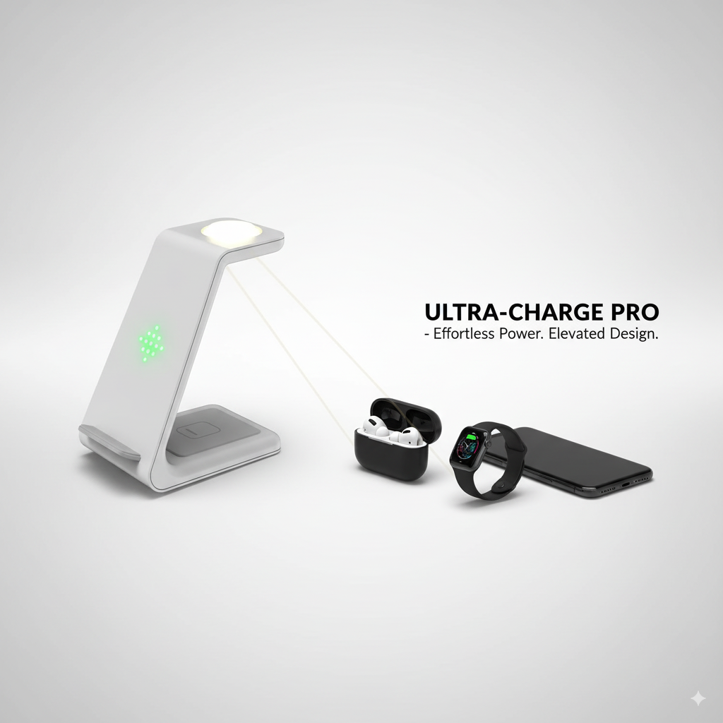 A compact charging hub that powers all your essentials – phone, AirPods, and smartwatch – at once.